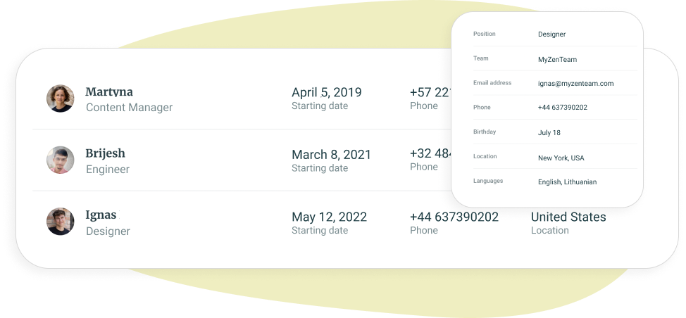 Import files from Google Sheets and Notion to help you set up MyZenTeam. New team members will easily get and include their information. Our support team will be there for you 24/5.